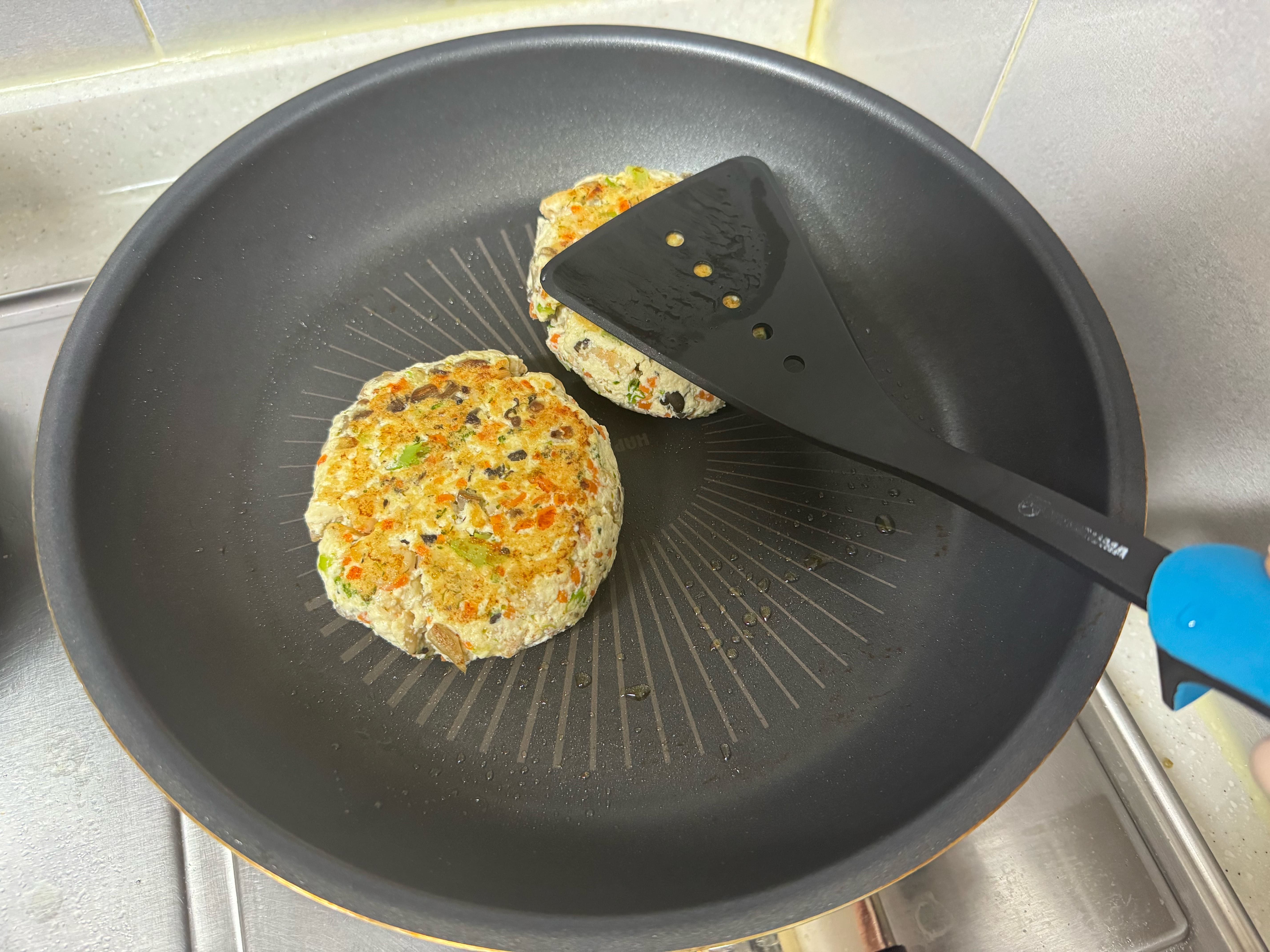 6. 중약불에 달군 팬에 오일을 가볍게 두른 후 새우 두부 스테이크를 올려 그대로 8분간 두세요.