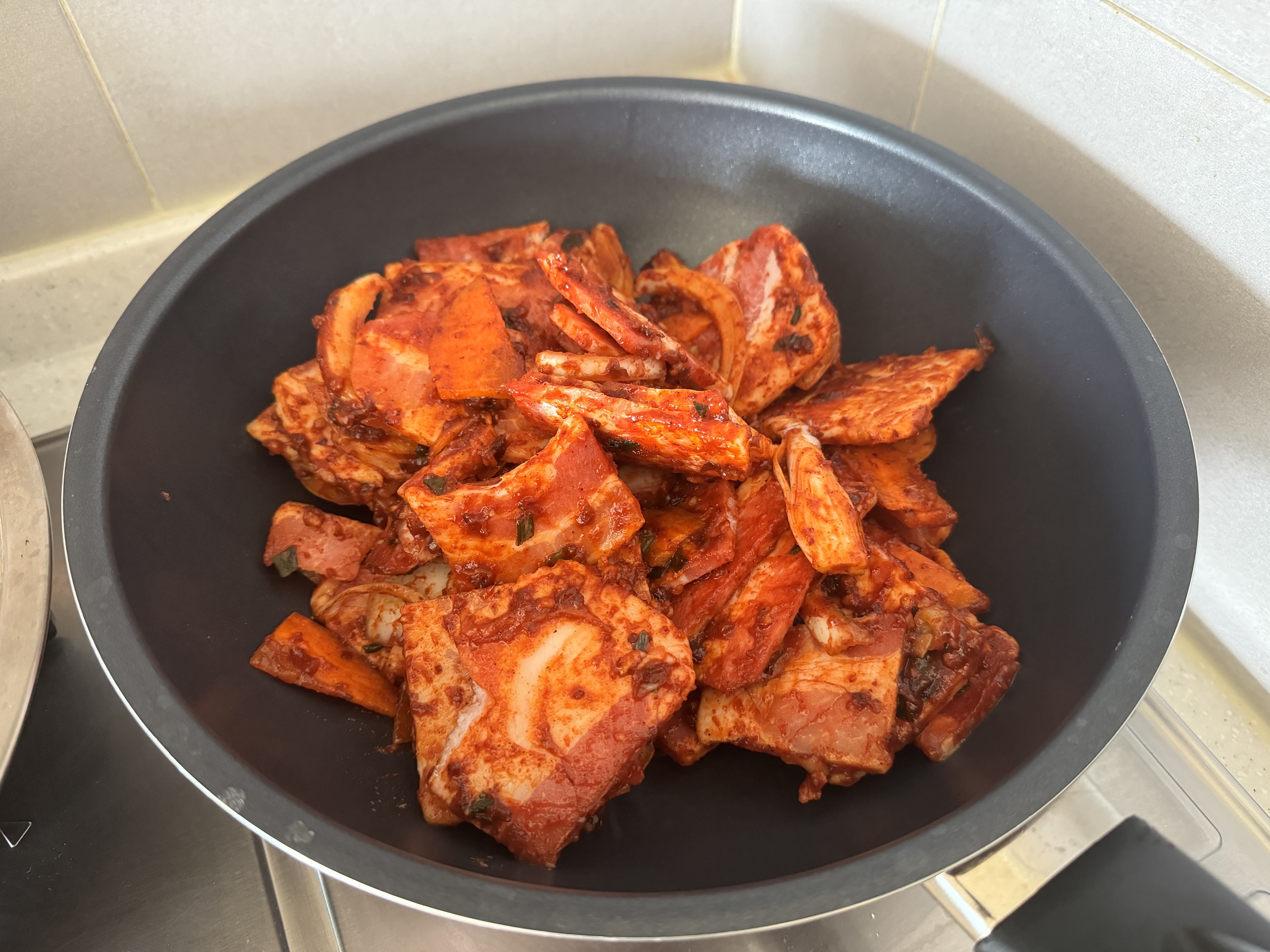 4. 냉동 삼겹살을 넣어 버무립니다.
