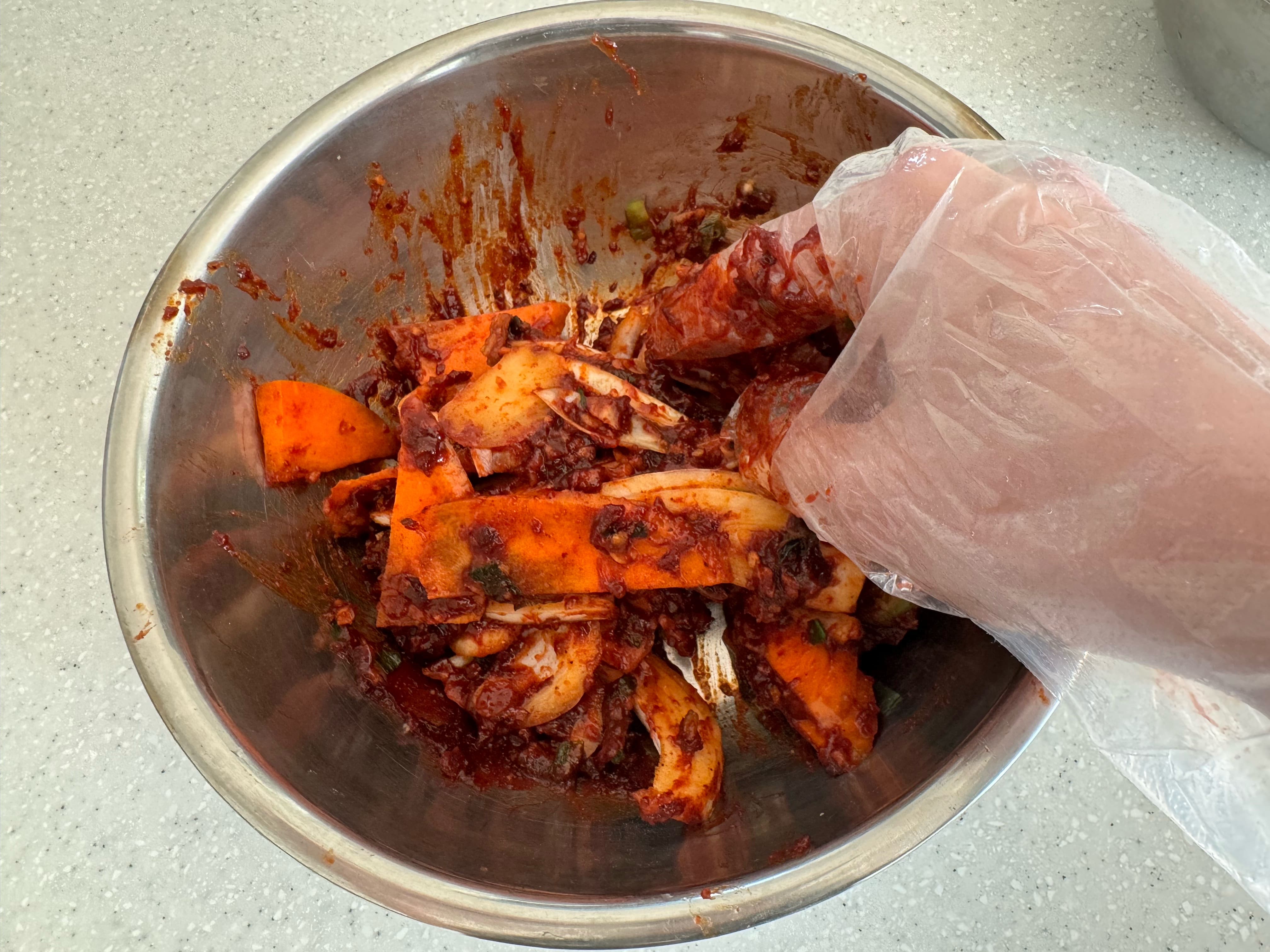 3. 손질하여 자른 당근과 양파를 넣고 양념에 버무려주세요.